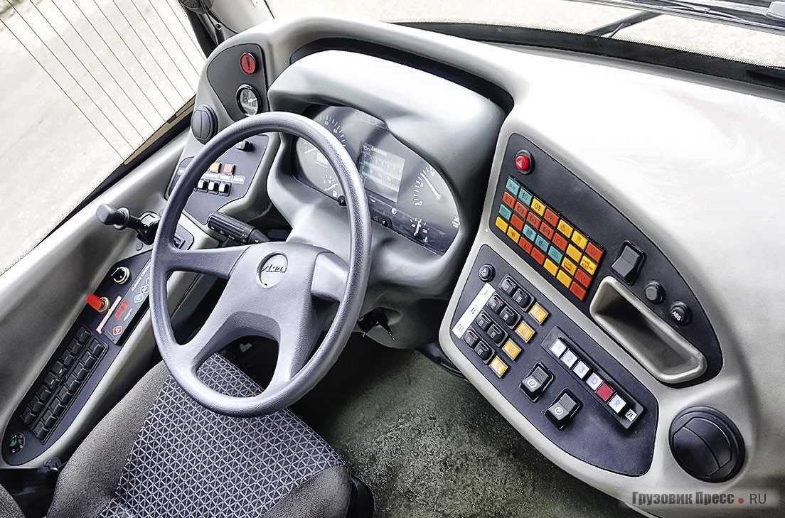 Рабочее место водителя соответствует мировым стандартам по комфорту и эргономике. Приборная панель оснащена мультимедийным экраном и вместе с рулевой колонкой регулируется по высоте и углу наклона. Рабочее место водителя оснащено эргономичным сидением на пневмоподвеске с подлокотниками, регулируемым наклоном спинки и электроподогревом, что особенно актуально в холодном климате.