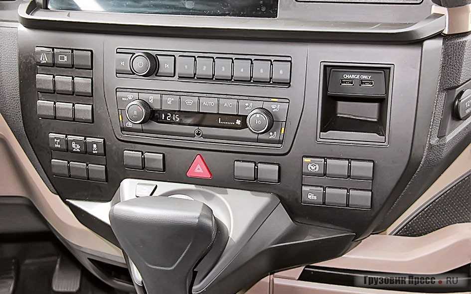 К автоматизированной КП претензий нет, она под стать мотору вполне своевременно заботится о верном передаточном отношении. Для специфических условий перевозок её снабдили аж целым десятком прошивок: от экономичных до тяжестей и бездорожья, не забыв даже про наливные грузы. В протестированном тягаче алгоритм КП был обогащён функцией «выезда методом раскачки» — пригодится нашему человеку… Электрический «ручник» работает адекватно.