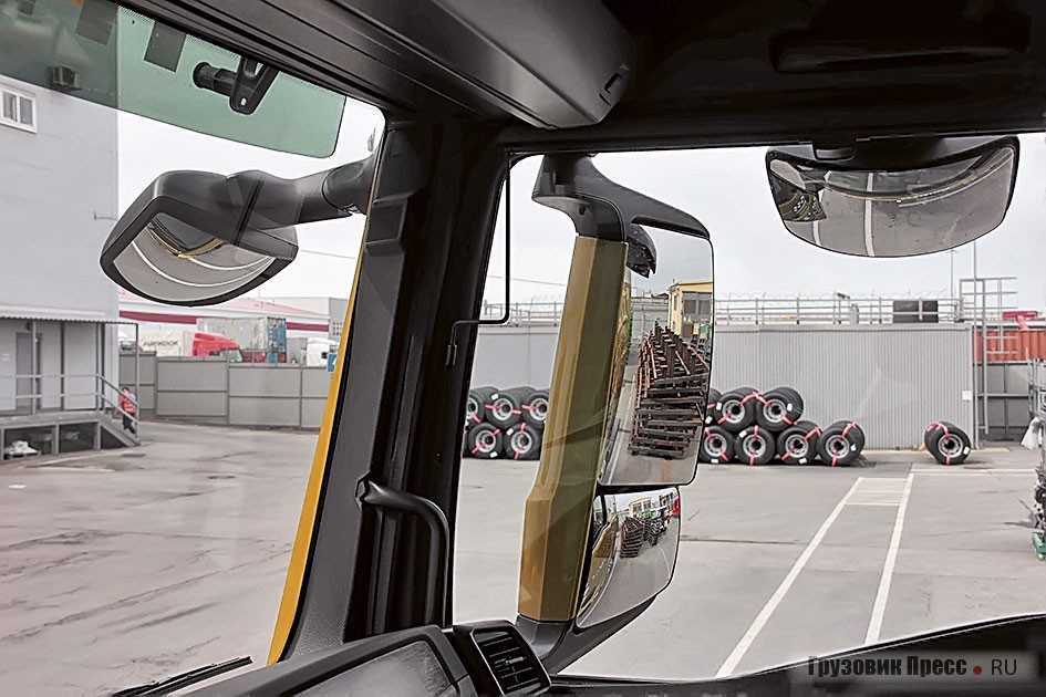 И в самом деле, полуприцеп забалластирован на скучные 6 т, отчего управление автопоездом по ровным одиноким дорогам полигона через несколько минут откровенно надоедает: слишком уж всё правильно и идеально. Поэтому надо ехать на площадку – освежить навыки маневрирования, в том числе в узком коридоре и задним ходом. И вот тут же возникло первое замечание – огромные зеркала частично перекрывают обзор!