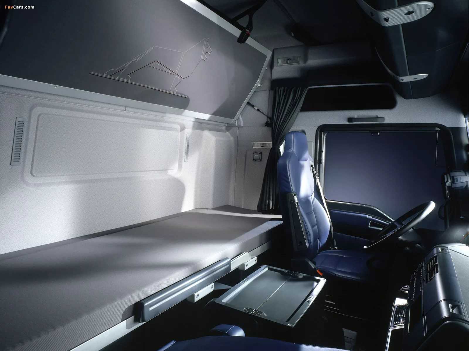Свободному перемещению по кабине немного мешает большой моторный тоннель. Однако разуться и забраться на спальное место ни он, ни что-либо другое ничто не помешает. Спальной полки шириной 750 мм вполне хватает водителю любой комплекции. Рядом с ней размещён блок управления автономным отопителем, и с этого же блока можно управлять стеклоподъёмниками и освещением кабины, лишний раз не покидая спальной полки. Под спальным местом — внушительных размеров багажный отсек с доступом из салона и снаружи.
