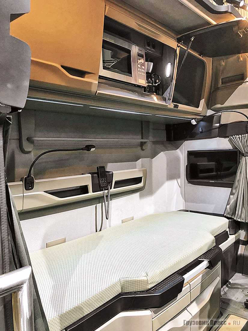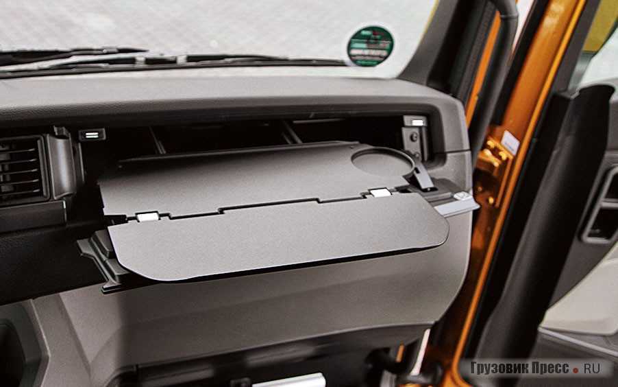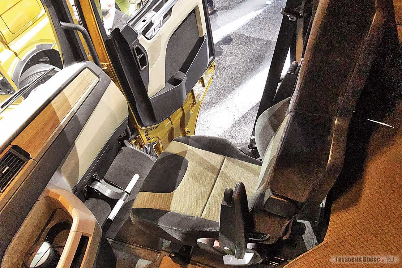 Сиденье водителя просто роскошное, с пневматической подвеской и регулировкой высоты на девять уровней. Есть функции памяти и быстрого опускания, которая облегчает вход и выход из грузовика. Сиденье второго водителя производства Vario очень хитрое, оно не только функциональное, но и обеспечивает дополнительное пространство в кабине. В тягачах MAN TGX оно может поставляться с поворотной функцией. А если верхнюю часть спинки сиденья наклонить вперед и открыть, появляется стол размером примерно A2 со встроенным держателем чашки.