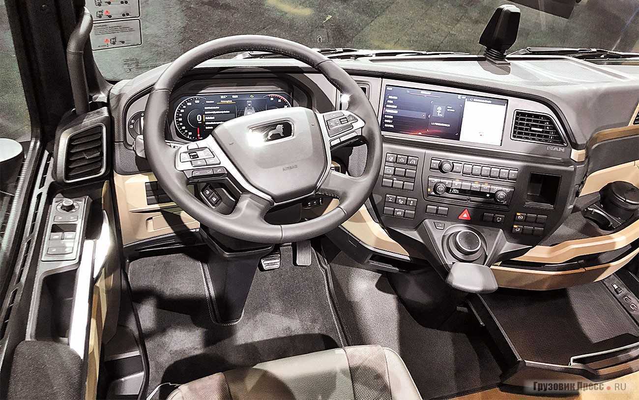 Рулевое колесо многофункциональное, оно регулируется по высоте на 110 миллиметров, а по углу наклона в диапазоне от 20 до 55 градусов. Объём кабины в новом поколении седельных тягачей MAN составляет 1148 литров, но и это не предел, в версии MAN Individual пространство для хранения может быть увеличено до 1400 литров. В кабинах с высокой крышей над ветровым стеклом расположены три больших отсека для хранения вещей, в которых есть место для всего, что нужно водителю для поездки, продолжающейся несколько дней. В совокупности они обеспечивают до 355 литров пространства для хранения.