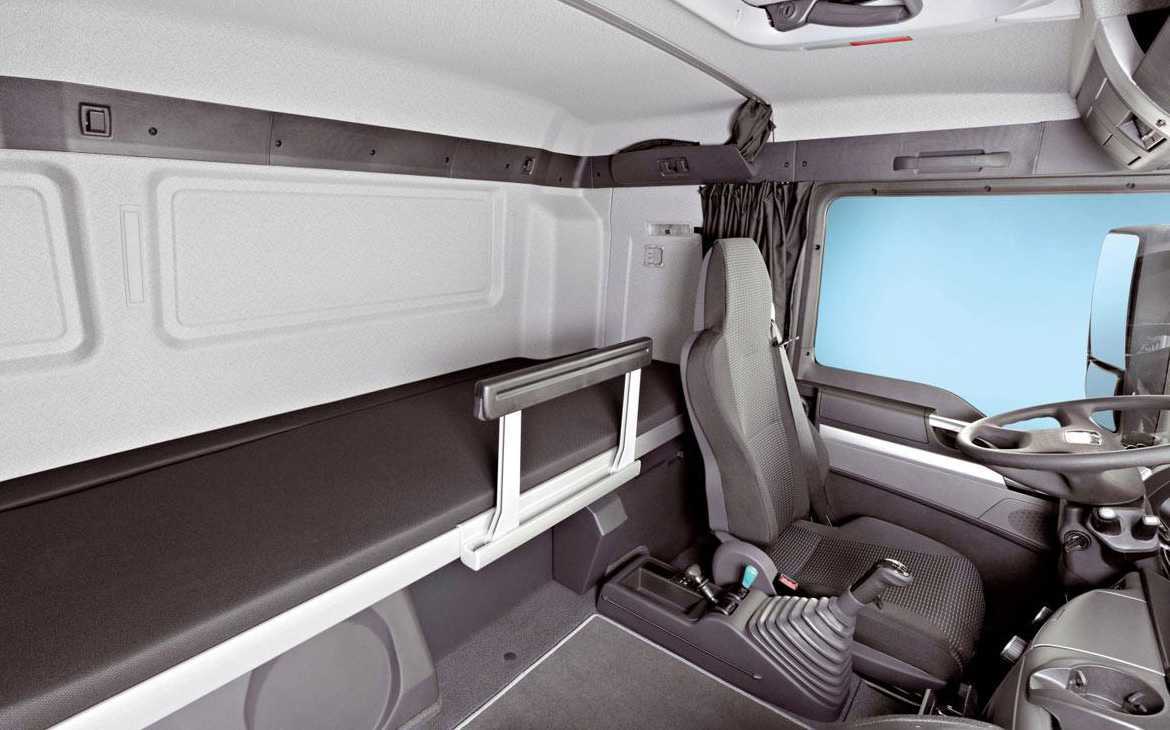Кресло водителя и сама кабина оборудованы пневматической подвеской, пассажирское же сиденье имеет жёсткую фиксацию. Интерьер кабины можно охарактеризовать как простой и элегантный, но удовлетворяющий основным условиям работы. В отделке интерьера присутствуют не только пластик и ткани, но и металлические декоративные элементы. На руле, приборной доске и боковинах окна располагается множество функциональных кнопок и регулировок. Также предусмотрены удобные подставки под кофейную чашку, телефон; ящички под всевозможные личные вещи.