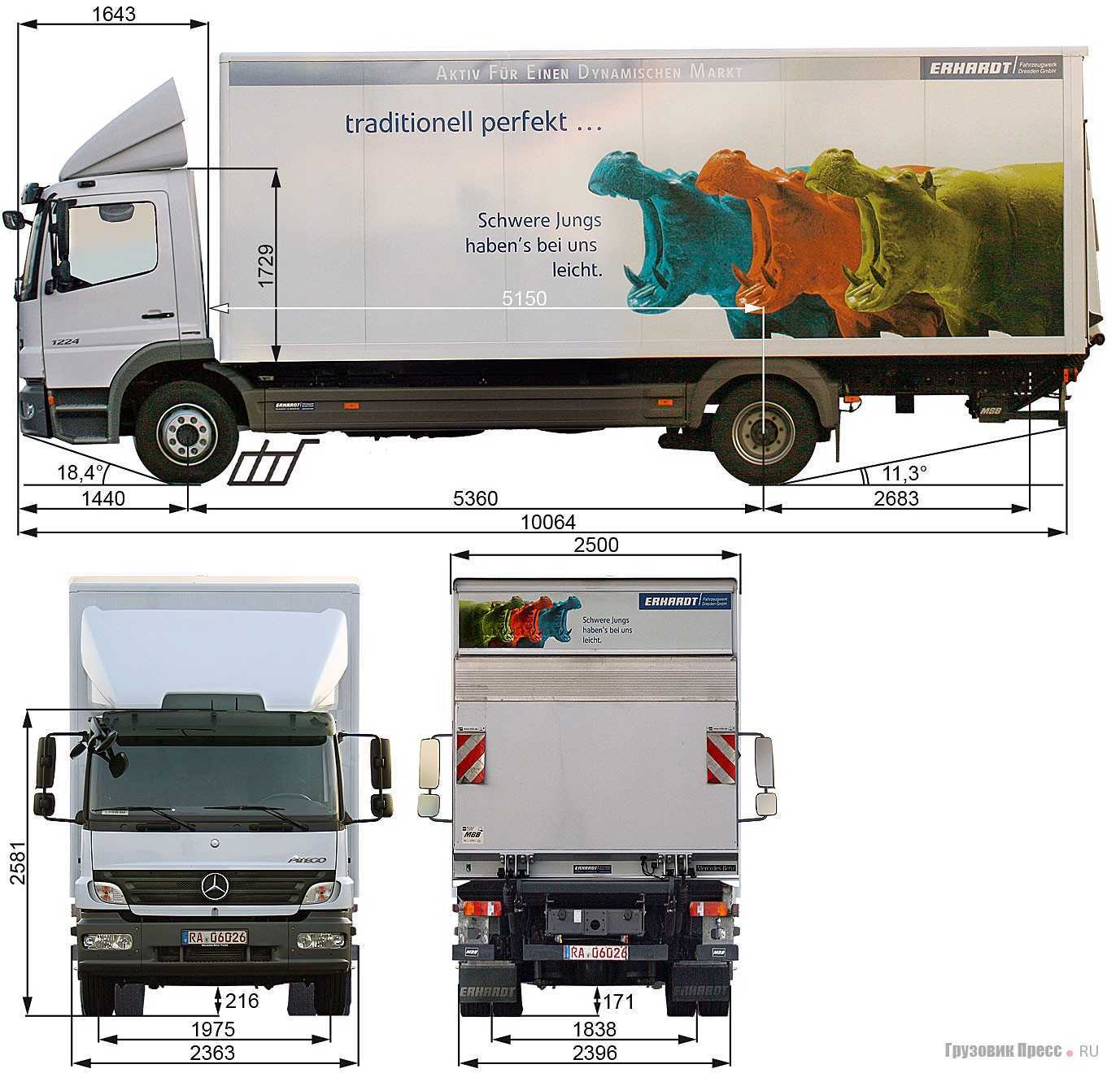 Сразу важно сказать, что основные характеристики Мерседес Атего определяются, исходя из выбранной комплектации и модификации. Так, габариты машины составляют 6,025-9,065/2,311/2,527 м, дорожный просвет на всех моделях одинаковый и составляет 17 см